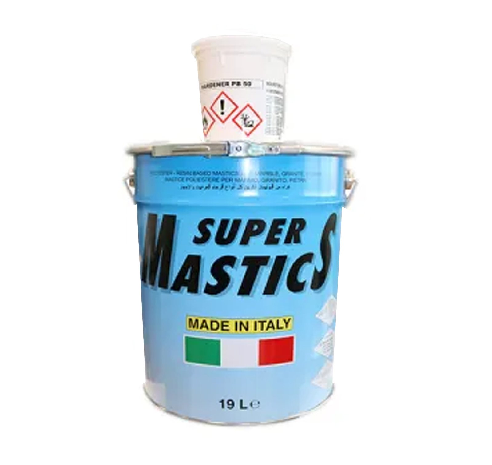 TAKE WITH A WELL CLEANED SPATULA THE NEEDED QUANTITY OF SUPERMASTICS® FROM THE TIN. ADD THE HARDENER (THE QUANTITY